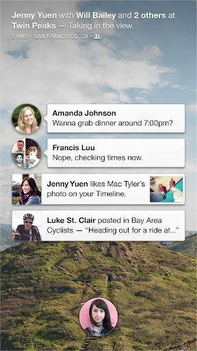 Notifications from Facebook appear right on your home screen and stick around until you need them. Open a notification with a tap or clear them away to see your cover feed.