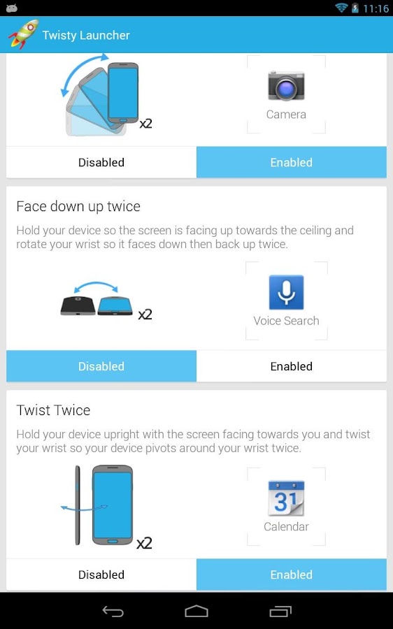 No need to fumble around trying to quickly open your favorite apps. Twisty launcher allows unlocking up to three different gestures. Each gesture can be configured to launch the app of your choosing.