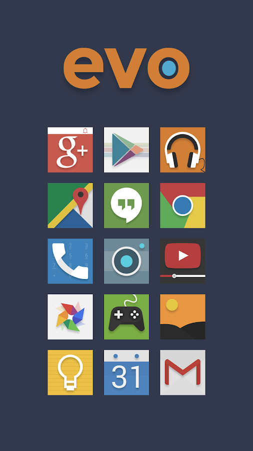 Evo is all about a creative take on the traditional square icon pack. We've made hundreds of unique design tweaks to ensure icons have a fresh style, yet still be instantly recognizable. The subtle drop shadow and uniform colors blend perfectly with the included geometric and material design inspired wallpapers.